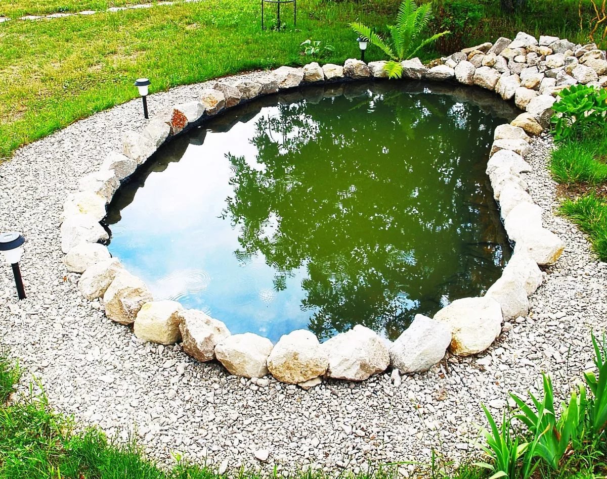 Создание декоративного пруда на даче с помощью крупной гальки