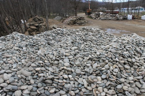 Крупная галька этого типоразмера (от 100 до 300 мм) уже напоминает небольшие валунчики: это красивый и гладкий речной камень, получивший свою округлую форму от сил природы – волн и течений. Благодаря удобной уплощенности отделка этим натуральным камнем становится очень простой: по сути, это готовая естественная облицовочная плитка или брусчатка для мощения. Такая галька, цена которой у нас низка благодаря собственной добыче, отпускается в мягких контейнерах или насыпом в кузов машины, тоннами. Эти симпатичные плоские натуральные камни у нас можно поистине удачно купить оптом!